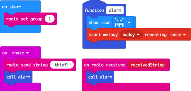 Look at our Tilt alarm project above to understand how procedure-like functions work. Here we use a function called ‘alarm’ which makes it easy to reuse a section of code. It's used twice: to show a visual and audible alert signal both when it’s shaken, and when it receives an alarm radio message from another micro:bit.