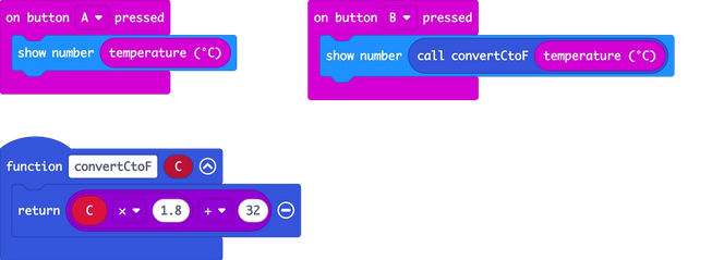 The function then returns it back to the show number block, so your micro:bit can show the temperature in Fahrenheit as well as centigrade on its LED display.