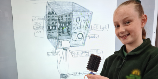 The proposal involves using two BBC micro:bits: one that is worn and another that controls the box. The wearable micro:bit measures your heart rate and blood pressure and lets you know when it might be a good time to use the Total relax.