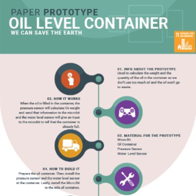 Wan Ahmad from Malaysia made a paper prototype of a cooking oil container that weighs the stored oil. He wished to prevent the pollution of the oceans that occurs when people pour cooking oil down the sink and felt his idea could encourage his community to recycle.