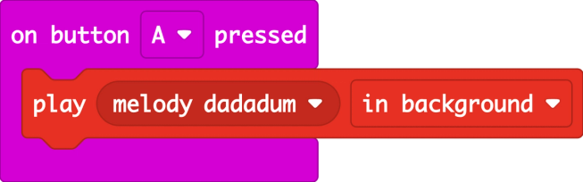 The MakeCode music category now has a simpler ‘Play’ block for playing different kinds of sounds. So, if you’re building a project that uses the old ‘start melody’ block using a built-in tune, scroll down to ‘Melody Advanced’ and pick the ‘play melody dadadum’ block instead, as shown below. Any existing code that uses the ‘Start melody’ block can still be used, and your block will appear as normal.