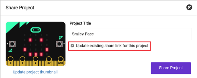 Another benefit of signing in to MakeCode is that you can now create shareable links to projects that update when you update your code. So teachers can share links with students to starter code or a project for an assignment, update their projects and keep the same sharing link.