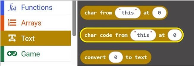 - Char code from string: This is a helpful Text block that will return the ASCII code of a character in a string at a specified index position.